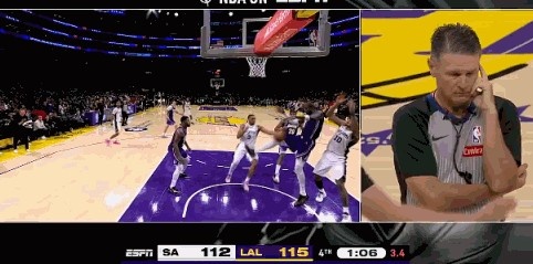 2025-11-06 16:14:18尚帕尼三分不中篮板混战出界&吹给马刺球权 湖人挑战成功拿回球权